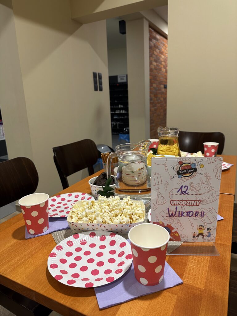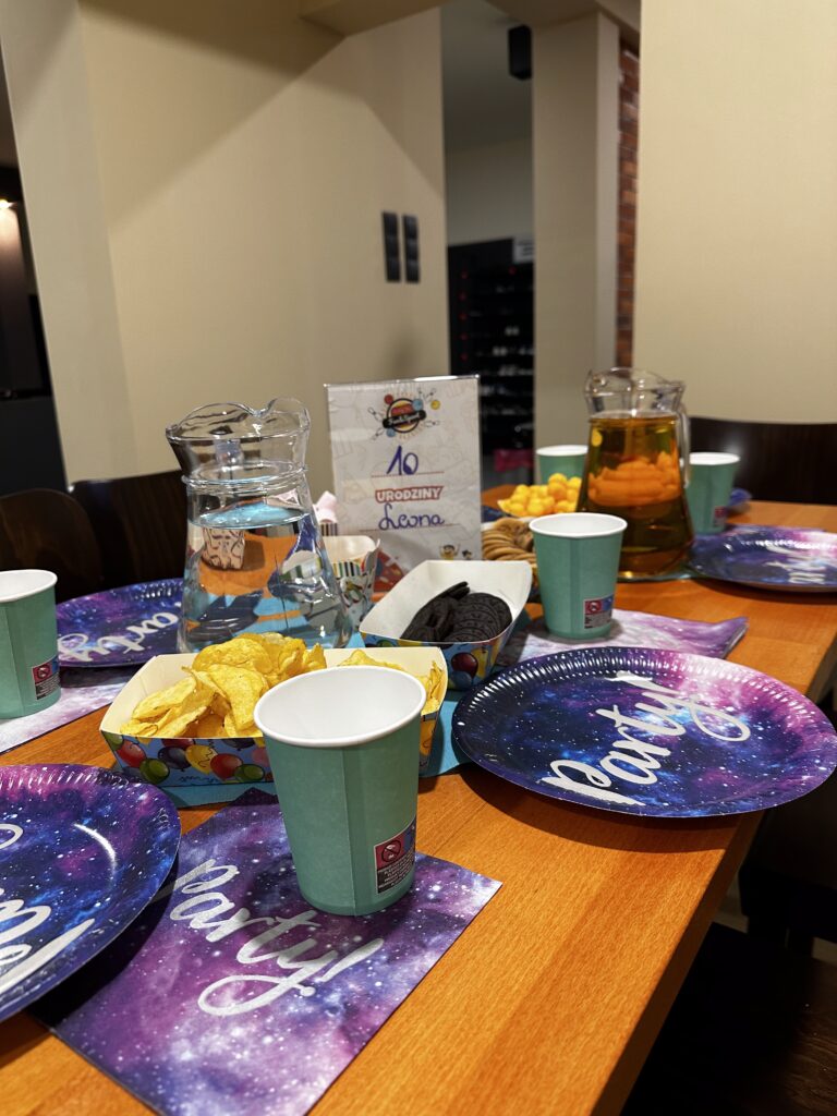 - Rezerwacja stolika w kawiarni, kolorowa zastawa i urodzinowe dekoracje,